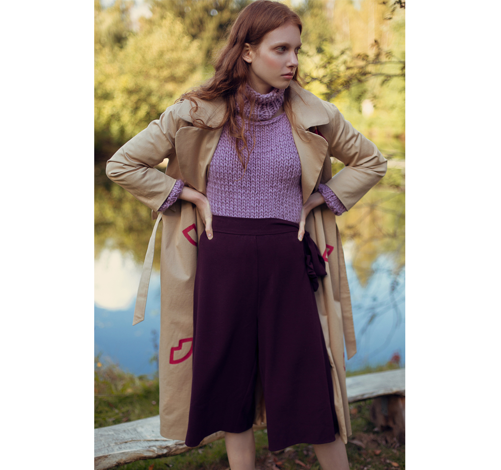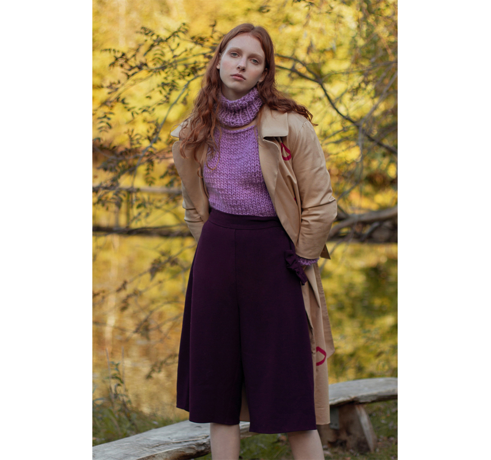 Pants in aubergine jeans color made of 100% Cotton. The model is  tied at the waist. Fastened with zipper.