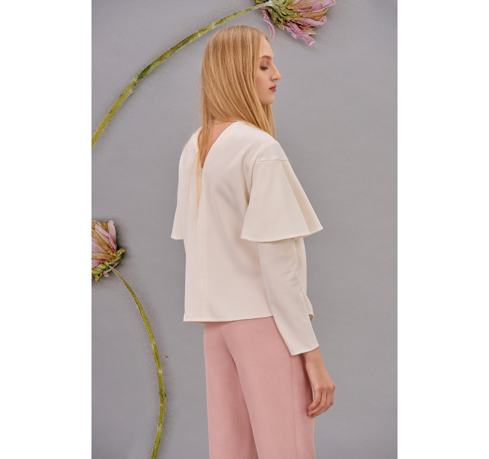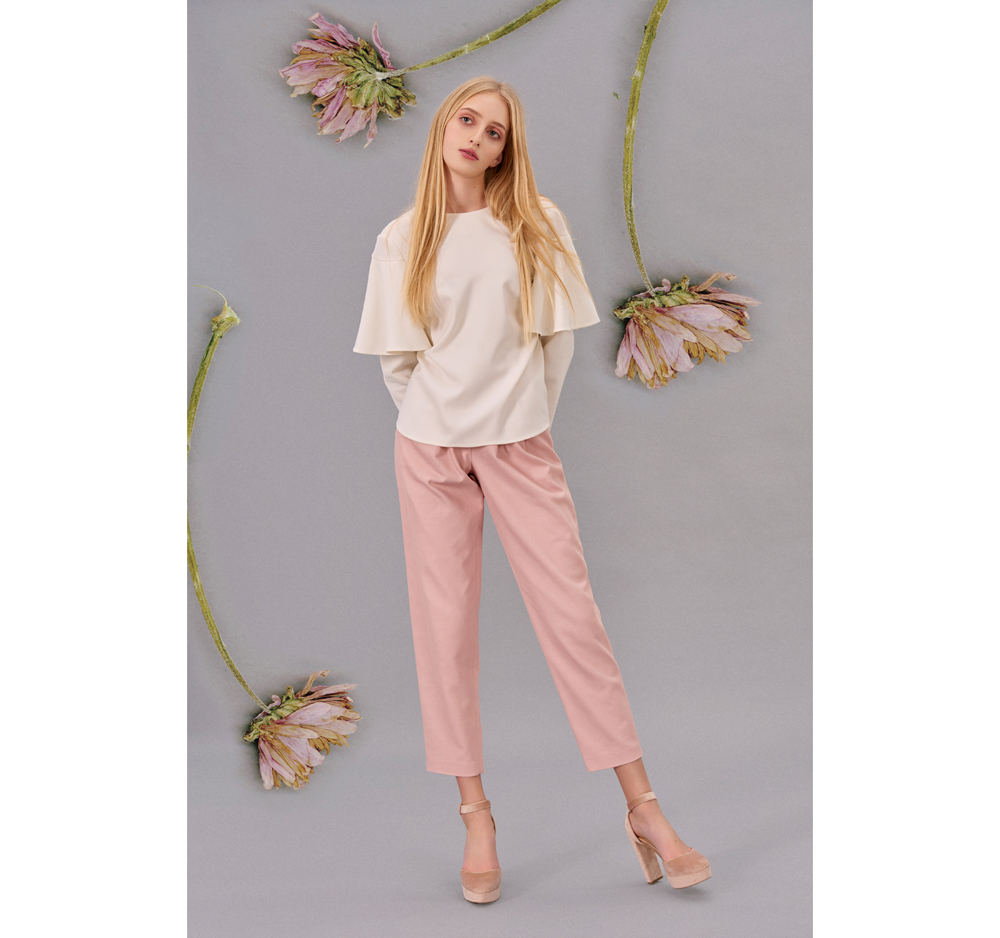 Pants in light pink color made of 100% cotton. The model has darts at the waist. Fastened at the waist with jewelry button and zipper.