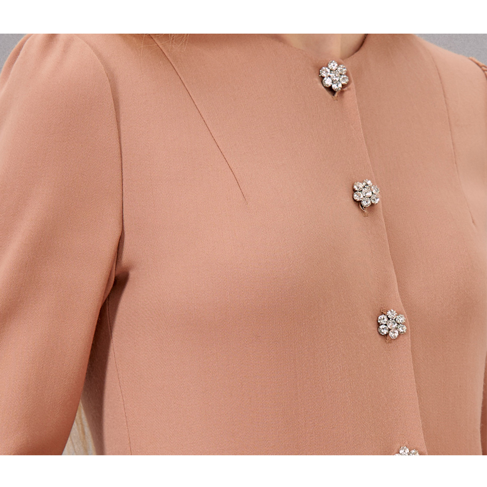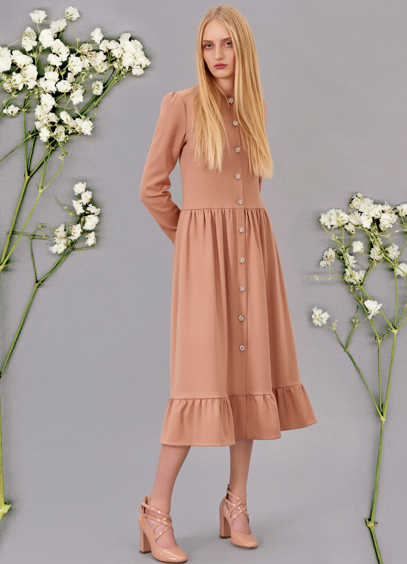 Dress in light powder beige, made of 100% Italian finest wool. The fabric is very well laid out, tight-knit, resistant to creases, smooth and pleasant to the touch. Long sleeves have puffs, the lower part is decorated with a frill. Front fastened with jewelry buttons. The lining comes in a light pink color.