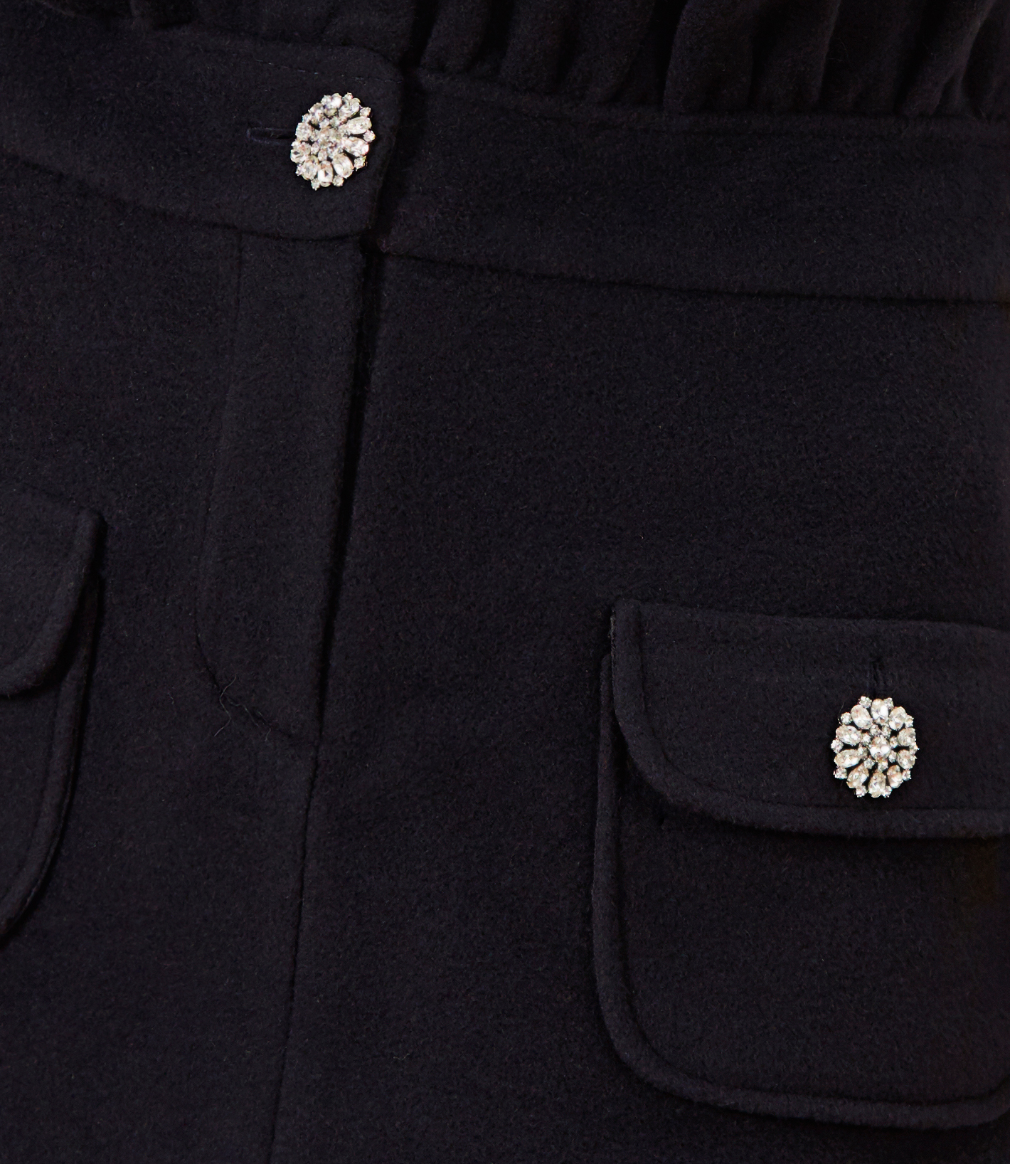A line mini skirt in dark navy color, made of 100% Italian wool. Model fastened by zipper, finished with jewelry button. A decorative frill on the top, two pockets with buttons on the front. The lining comes in matching color.