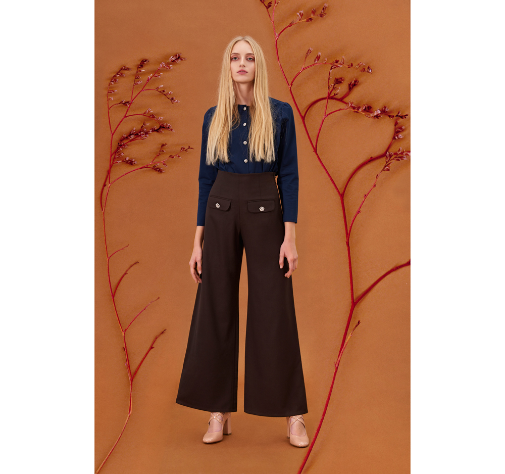 70's style trousers in chocolate color made of 100% Italian finest wool. The fabric is very well laid out, tight-knit, resistant to creases, smooth and pleasant to the touch. Model zipped on the side. There are decorative pockets on the sides, finished with jewelry buttons. Widened from the waist to the bottom.